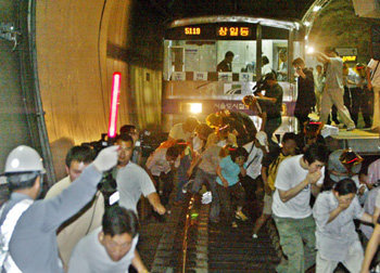 17日下午,在首爾地鐵5號線新琴湖站,乘客們正在進行假裝地鐵著火,利用地鐵隧道緊急逃生的演習。