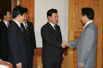 23日下午在青瓦台,盧武鉉總統(右)正在與第15屆南北部長級會談的北韓方面的代表團團長——內閣責任參贊權浩雄握手。在一旁看著盧武鉉接見北韓代表團的人是南方的首席代表——統一部長官鄭東泳。