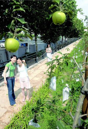 圖爲,梅雨恢復穩定的28日下午,在首爾清溪川路散步的市民們正在觀察蘋果樹。將於10月1日竣工的清溪川兩側除忠北忠州市種植的120棵蘋果樹以外,還種了慶北尚州市送來的90棵柿子樹、慶北榮州市提供的5400多棵野杜鵑花等全國各地的特産。