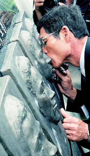 29日上午,在京畿道平澤市海軍第2艦隊司令部舉行的西海交戰3周年追悼儀式上,已故徐侯元中士的父親正把自己的臉貼到刻在追悼碑上的兒子臉上。