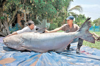圖爲,30日在泰國湄公河捕撈到的全球最大的淡水魚,這條魚重達293公斤。捕撈到這條鯰魚科淡水魚的消息被立即報告到世界野生動物基金和國家地圖協會的聯合研究專案組。世界野生動物基金近來開展了保護和研究身長超過1.8米、體重90公斤以上淡水魚的活動。
