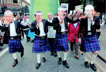世界8大工業國(G8)首腦會議將以解決非洲貧困爲主要議題,從6日開始在英國蘇格蘭拉開帷幕。圖爲,在G8首腦會談即將舉行之際,示威者們在愛爾蘭都柏林街戴著面具,舉行了遊行。他們主張:“G8國家表面上看似乎要援助非洲,但實際上對援助非常吝嗇。”