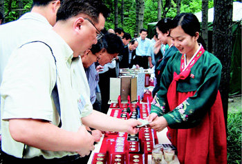 6月29日,在平壤萬景台金日成主席生前住宅內,穿著韓服的女售貨員正在向南韓遊客出售圖畫等紀念品。直到2003年訪問時爲止,很難想象金日成主席生前住宅內會出現櫃檯。