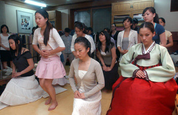2日,在首爾江南區新沙洞韓服設計師李英姬的茶道室內,由韓國領養兒組成的美國西雅圖的“陽光舞蹈團”(音譯)成員正在接受禮儀教育。