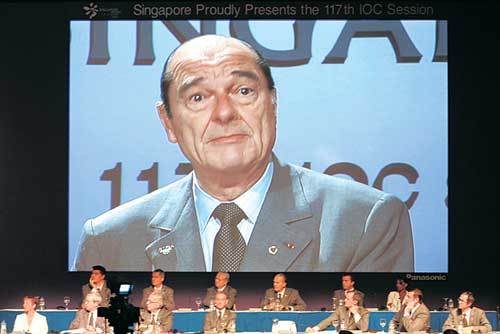 6日,在新加坡舉行的國際奧林匹克委員會(IOC)第117屆大會上, 進行2012年夏季奧運會巴黎申辦提案演說的法國總統雅克•希拉克出現在大螢幕上。圍繞申辦2012年夏季奧運會,巴黎和倫敦、紐約、馬德里、莫斯科等5個城市一直都在進行激烈的競爭。