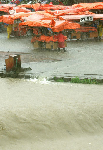 11日淩晨開始下起的暴雨在大田忠南地區引發了泥石流,導致湖南高速鐵路上行線被迫推遲3小時運行,損失嚴重。暴雨還淹沒了大量農田。圖爲,在大田東區大田川邊準備營業的篷車業主們爲躲避突然上漲的河水,急忙搬移篷車。