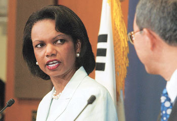 13日,在首爾鍾路區世宗路外交通商部舉行的內外電記者會上,美國國務卿賴斯(左)在回答問題時,舉目望向外交部長官潘基文。賴斯對韓國的對北重大提案給予了肯定性的評價。