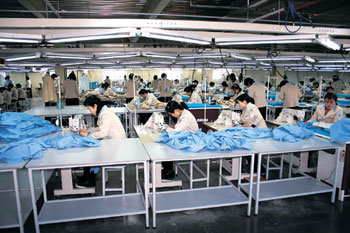 進軍開城工業園區示範園區的韓國企業認爲,開城工業園區最爲突出的優點是,“可以用廉價的費用獲得優秀的勞動力。”圖爲,服裝生産企業Shinwon的開城工廠中,北韓勞動者正在認真地工作。