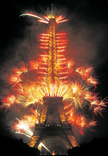 1789年7月14日,隨著市民襲擊巴士底獄,法國革命正式宣告爆發。如今,法國革命已經迎來了216周年。圖爲,14日晚,在巴黎埃菲爾鐵塔附近正在舉行大規模煙花活動。法國總統希拉克在紀念演說中提及1周前在倫敦發生的恐怖襲擊事件強調說:“爲了防止恐怖活動,全世界應該共同努力。”