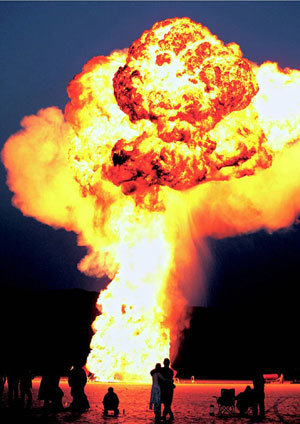 在美國內華達州弗拉納根(音譯)沙漠,16日舉行了再現世界第一次核爆炸的活動。名叫“Simnuke計劃”的和平運動團體爲迎接第一顆原子彈引爆60周年而籌備了當天的爆炸類比試驗,試驗以在壓縮液體燃料混合物上點火,用大型電風扇扇風的方式進行。