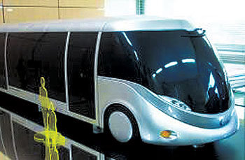 圖爲,像客車一樣可以在普通道路上行駛,也像電軌一樣在專用軌道上行駛的新概念車輛模型。18日,韓國鐵道技術研究院表示,計劃截至2009年,投入290億韓元開發將客車和地鐵的優點結合在一起的“新能源雙模式(Bimodal)低底盤鉸接式車輛”。該車型的車輛底盤接近地面,而且沒有乘車階梯,所以嬰兒車和輪椅也可以輕鬆上車。