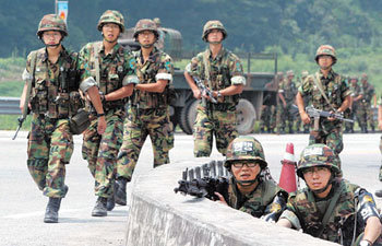 韓國軍方和警方爲拘捕20日在江原東海市海岸搶奪軍人槍械的犯罪嫌疑人進入了緊急狀態。圖爲,21日,武裝軍人部署到京畿道加平郡清平(音)檢查所。