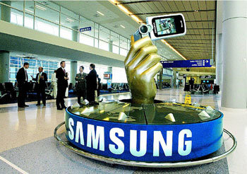 三星電子24日稱,日前與美國達拉斯沃爾斯堡國際機場簽署了合作夥伴協定,從而三星電子在機場地區擁有了設置廣告設施及銷售電子産品方面的優先權。在簽署協定的同時,機場內出現了高3米的手形Anycall手機造型物。