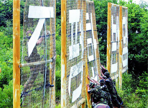 27日,在江原華川郡中東部戰線軍事分界線(MDL)地區,陸軍第7師的官兵正在拆除對北宣傳用立看板。南北韓雖然在去年就拆除軍事分界線地區的宣傳用設施達成了協定,但是因受阻的南北關係,導致作業被臨時中斷,最近才得以恢復。