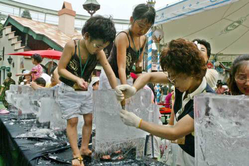 31日,在首爾松坡區蠶室樂天世界魔術島舉行了消解酷暑熱氣的冰雕活動。參加者可以在寬70釐米、長100釐米的冰塊上隨意進行雕刻。活動將舉行到8月1日。