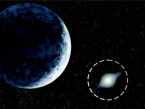 美國航空航天局(NASA)於上月29日(當地時間)公開了“第十大行星” “2003UB313”(虛線內)想象圖。目前,該星是否屬於太陽系第十大行星的問題引發了衆議。發現於冥王星軌道外側的該行星,主要由岩石和冰塊構成,距離太陽170億公里。據悉,該星比直徑爲1174公里的冥王星還大。該行星由美國加利福尼亞大學工學院教授邁克爾•布朗發現,如果該星被確認爲太陽系的新行星,那麽繼1930年發現的冥王星,將成爲太陽系第十大行星。