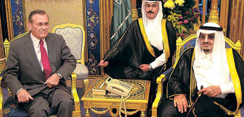 2001年10月,與美國國防部長拉姆斯菲爾德(左)會面的沙特前國王法赫德(右)。