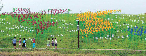 人們將“統一夢想”裝進了風車裏。爲強調南北是一體,用相同顔色的風車展現了韓半島的形狀。1日,在舉行世界和平慶典的京畿坡州市文山的臨津閣形成的風坡上,居民正在散步。和平慶典將舉行到下月11日。