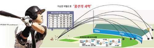 如果要打得遠,投球速度要快。只有這樣,球被木棒擊中時的反彈力才更大。當然,擊球速度也要快。李承燁的擊球速度達到時速140公里,這在美國職棒大聯盟也是一流擊球手的水平。