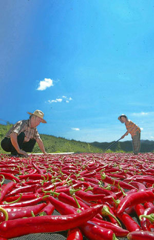 酷暑天氣仍在持續,但象徵進入秋天的立秋已迫在眉睫。圖爲,還有兩天就是立秋的5日,在慶北奉化郡祥雲面一戶農家,一對老夫妻正在曬辣椒。藍藍的天空與熟透的紅辣椒形成了鮮明的對比。