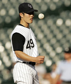 身穿49號球衣的金炳賢(26歲)和51號球衣的金善宇(28歲)。一起效力於科羅拉多洛基山隊的兩名金氏球員當天雙雙首發,以完美的投球幫助球隊取得2勝。