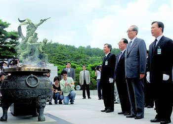 爲參加“自主和平統一8•15民族大慶典”於14日抵達首爾的北韓政府代表團團長金基南(右2)和統一戰線部第一部部長林東玉(右3)等人當天下午正在位於首爾銅雀區銅雀洞的國立墓地的顯忠塔前進行參拜。