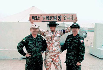 派往伊拉克的韓國軍人(中)和2名日本自衛隊員在寫有“獨島是大韓民國的國土”文字的宣傳條幅下微笑的照片正在韓國各網站上流傳。日本防衛廳向韓國政府表示抗議的同時,正在針對照片拍攝背景和流傳原因進行調查。