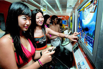 KTF爲了3D手機遊戲“GPANG”的宣傳工作,正在釜山廣安裏和海雲台海水浴場、忠南大田海水浴場以及全國主要大學街經營“GPANG移動體驗館”。圖爲,16日,模特們正在大田海水浴場的移動體驗館玩遊戲。