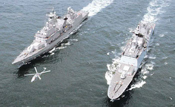 在22日開始舉行韓日聯合搜索及救助訓練前夕,由韓國海軍的最新驅逐艦——文武大王艦(右)和梁萬春艦以及反潛艇直升機組成的訓練部隊正在慶南鎮海市附近海域進行機動訓練。