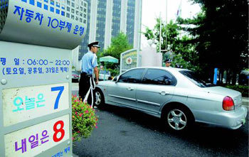 持續上漲的高油價給經濟造成了沈重的負擔。17日,政府决定對公共部門引入汽車星期制。但有人指出,政府應出臺更積極的能源對策。圖爲,在實行汽車十部制的首爾世宗路政府中央大厦前,執勤的警察正在確認汽車牌照號。