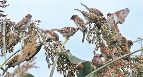 在首爾漢江市民公園上空飛翔的麻雀落在了玉米地。從覓食的麻雀身後看到的清朗的天空散發出秋天的氣息。8月最後一周的28日,汝矣島漢江市民公園和山上到處都是享受初秋情趣的遊客。