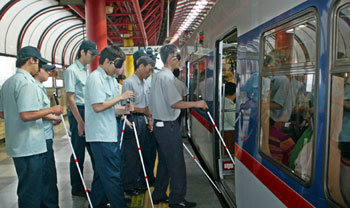 29日,在首爾地鐵3號線玉水站上,地鐵站職員和公益要員爲了防止發生視覺殘疾人跌落地鐵線路的事故,正在接受殘疾體驗教育。