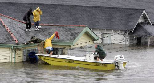 29日,在颶風“卡特裏娜”的襲擊下,新奧爾良等密西西比州一帶的低窪地區被水淹沒。圖爲,救助隊員們正在救助屋頂上孤立無援的居民。