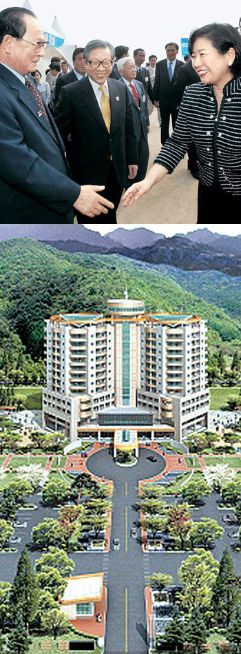 31日上午,在北韓江原固城郡溫井裏朝布村(音譯)舉行的金剛山離散家屬見面所竣工儀式上,現代峨山總裁玄貞恩(右)正在與北韓朝鮮紅十字會中央委員長張在彥握手。中間的是大韓紅十字會總裁韓完相。右面的照片是金剛山離散家屬見面所的鳥瞰圖。見面所將於2007年5月竣工。