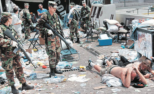 陷入無政府狀態的美國路易斯安那州新奧爾良地區隨著州防衛軍的投入,逐漸恢復了秩序。圖爲,3日,州防衛軍命令疑似掠奪者的兩名男子趴在地上,用槍瞄準他們進行監視。新奧爾良已下達了對掠奪者可以開槍的命令。