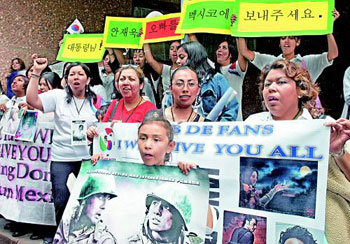 10日,在盧武鉉總統下榻的墨西哥城一家賓館前,一些墨西哥女性展開示威,要求讓韓國藝人張東健、安在旭訪問墨西哥。