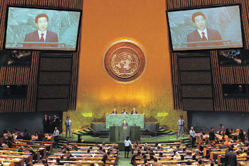 14日(當地時間),通過美國紐約聯合國總部聯合國峰會會場大螢幕,正在直播盧武鉉總統在第60界聯合國峰會高層會議上的基調演說。