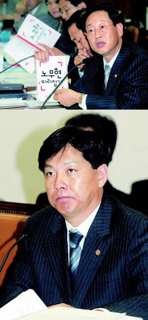 23日,對國會文化觀光委員會國政宣傳處進行國政監查過程中,國政宣傳處長金蒼浩編寫的《趕超盧武鉉》引發了爭議。圖爲,大國家党議員李在雄(右)質疑國政宣傳處大量購買並發放以“金蒼浩”的個人名義編寫的該書是否存在問題,金蒼浩(左)正以僵硬的表情凝視。