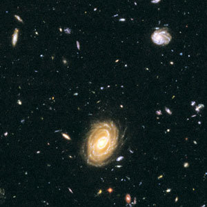 圖爲,美國天文學家27日公開的巨大銀河“HUDF-JD2”(中)。我們所處的銀河年齡長達130億年,該銀河的年齡與我們所處的銀河相比相當於“兒童”,僅爲8億年,但是質量是我們所處銀河質量的8倍,被稱作“巨嬰(Big Baby)”。迄今爲止一直認爲,銀河會隨著恒星聚集逐漸發展成大的銀河系,但該銀河的發現推翻了這一理論。