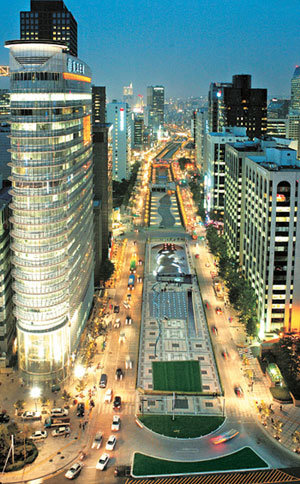 道路和道路相遇會形成村莊,道路和水相遇將形成渡口。道路和水以及人相遇後形成了城市,重生的清溪川正承載著首爾流淌。1日,被混凝土覆蓋近半個世紀的清溪川重新恢復了原來的容貌。圖爲,在首爾宗路區世宗路東亞日報社前向清溪廣場方向眺望的清溪川夜景。
