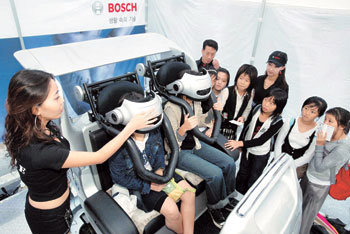 汽車零部件公司——BOSCH韓國以“生活中的技術”爲主題,於上月30日在京畿果川市首爾樂園舉行了“BOSCH DAY 2005”活動。圖爲,學生乘坐類比裝置,正在體驗電子式防滑安全系統。本次活動將舉行到3日。