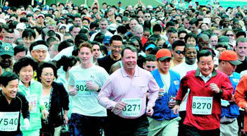 3日,在首爾蠶室奧運會主場地舉行了首爾江南區主辦的國際和平馬拉松大賽。駐韓美軍司令查爾斯•坎貝爾(前排中間)等美軍將士和江南區的國外姐妹城市相關人士等2萬多人參加了該大賽。參加費用中一部分將組成慈善基金用於將在美國阿肯色州小石城麥克阿瑟公園內建設的“韓國戰爭紀念廣場”專案上,一部分通過聯合國兒童基金(UNICEF)用於國內外糧食及教育環境改善專案上。