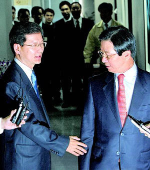 17日,到政府果川大廈與法務部長官千正培告別的前檢察總長金鍾彬顯得非常輕鬆。當天上午,金鍾彬與千正培長官見面10分鐘,他在出來之後稱:“此次事件不是情感引發的問題。”但是卻顯示出“該說的都說了”的表情。圖爲,千正培長官在辦公室送走前總長金鍾彬。