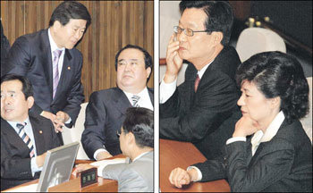 開放的我們黨和大國家黨19日圍繞對方的理念和認同感展開了攻防戰。開放的我們党議長文喜相(左照片右)當天在國會總會議場與議員們正在討論對策。大國家黨代表朴槿惠(右照片右)對議員們使用“同志”的稱呼,敦促他們參與“救國運動”。