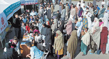 23日,爲支援因地震陷入悲傷的巴基斯坦,本報社-首爾峨山醫院醫療支援隊在距離巴基斯坦首都伊斯蘭堡100公里的阿布塔巴德阿尤布大學醫院(音)展開了治療工作。數百名婦女和兒童患者爲了接受治療排起了長龍。