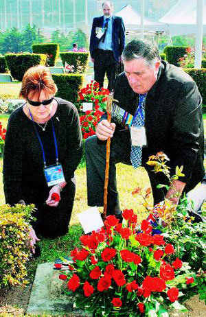 “你是爲了這片土地流血,永遠長眠……”在聯合國成立60周年紀念日24日,來到釜山南區大淵洞聯合國紀念公園的6.25戰爭戰死者的遺屬正在向墓地獻上一朵玫瑰。當天有40多名遺屬從各國來到了該墓地。