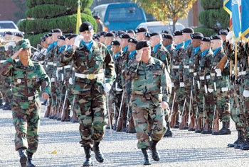 7日上午,在首爾龍山駐韓美軍基地的Knight Field練兵場上舉行的韓美聯合司令部創立27周年紀念儀式上,韓美聯合司令官利昂•拉伯特(左3)和副司令官李熙元(左)正在檢閱官兵。
