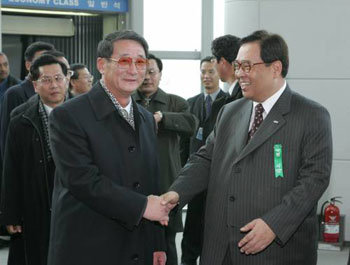10日,爲參加本月11日到18日舉行的國際紅十字國際聯合會與紅新月會第15屆全體大會,北韓紅十字會副委員長白容浩(左)等代表團一行人員正在大韓紅十字會副總裁李世雄的迎接下進入仁川機場入境處。