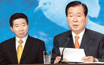 6月13日,爲紀念6•15南北共同宣言發表5周年,由延世大學金大中圖書館主持在首爾中區獎忠洞新羅酒店舉行的國際學術會議開幕式上,前總統金大中(右)正在看著發表主題演講的盧武鉉總統。