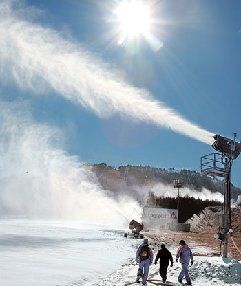 隨著氣溫降至零下,韓國各地的滑雪場正在準備迎接客人。15日,江原平昌郡龍平滑雪場投入數十台造雪機製造人工雪。全國各地的滑雪場大部分將在本月中旬後開放。